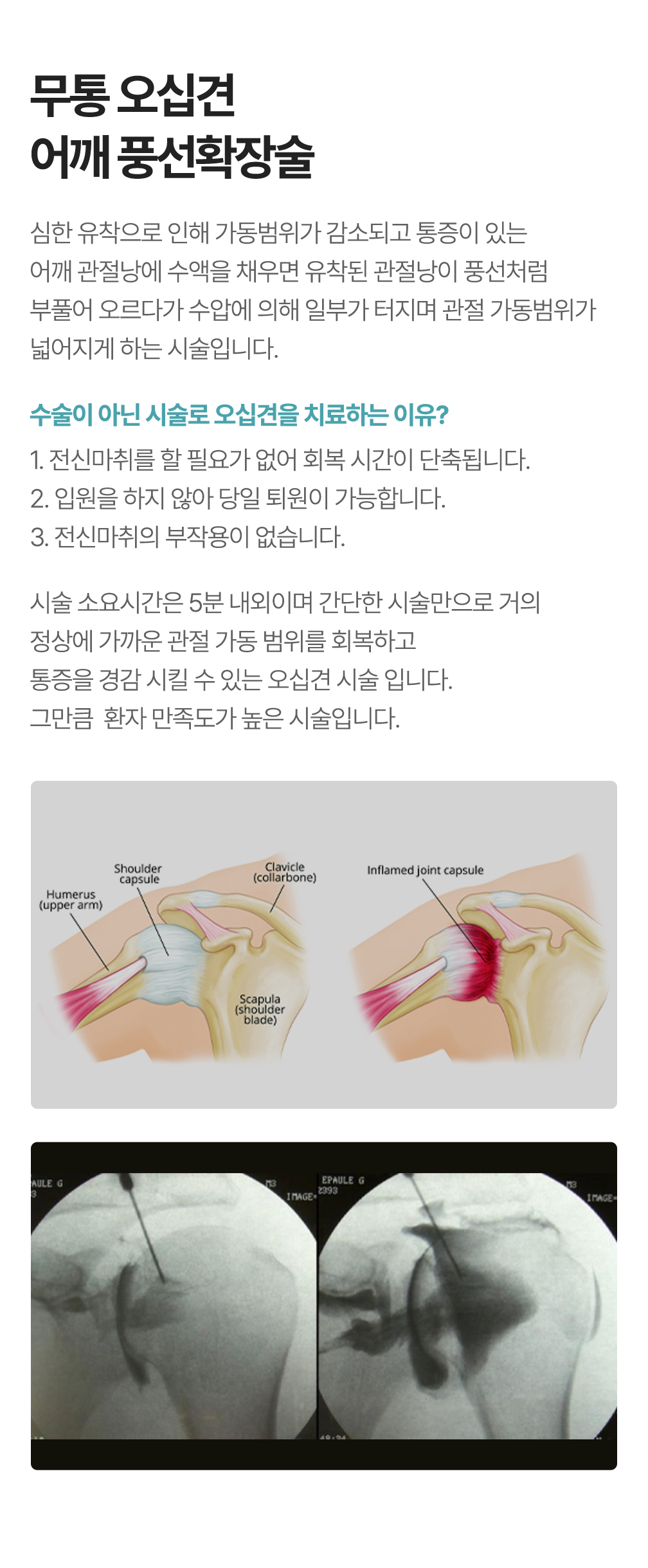 - · 어깨질환 : 회전근개파열, 석회화건염, 충돌증후군 등
